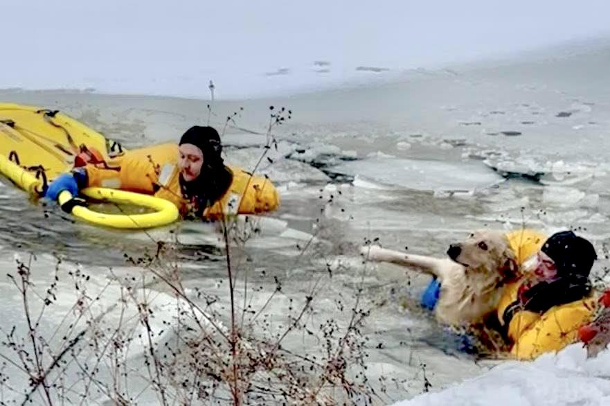 “I called 911 quickly when I realized we could not get her to safety,” she said. “She would try to get out, and flip over backwards and go under water. I was afraid she would get stuck under the ice.”