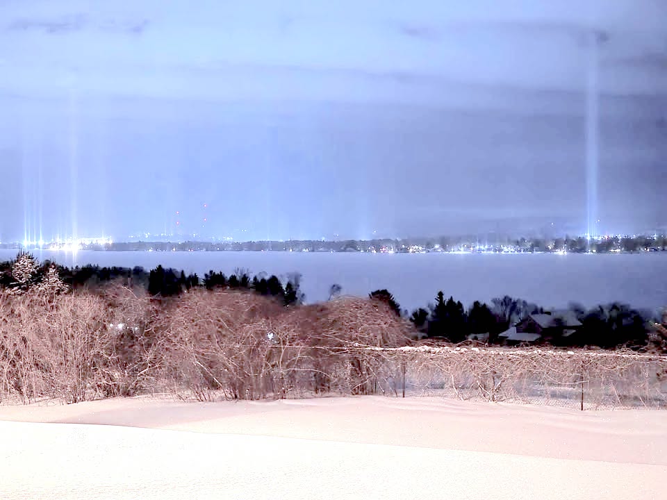 This photo, submitted by Jared Paxton, shows light (Ice) pillars over Chautauqua Lake in Bemus Point, Sunday night.