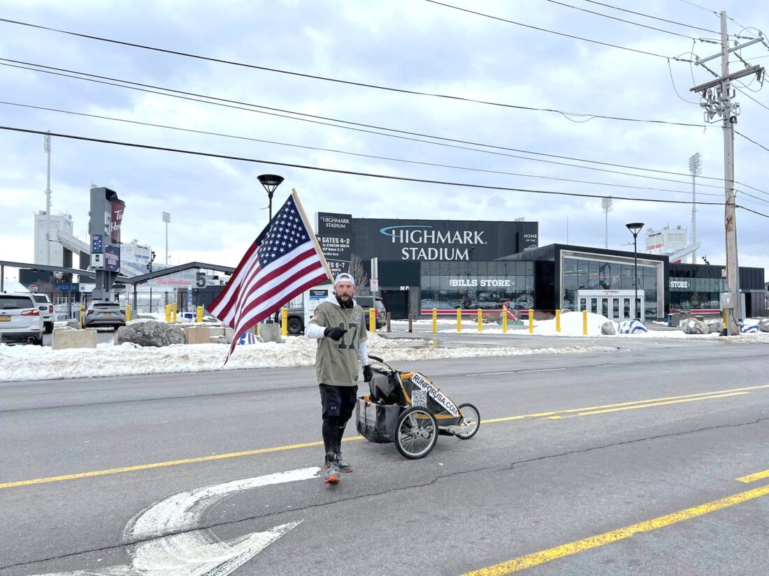 - Pictured is Noah Coughlan during his run across America, as he enters into the Chautauqua County area, standing outside Buffalo’s Highmark Stadium.