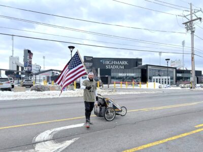 Pictured is Noah Coughlan during his run across America, as he enters into the Chautauqua County area, standing outside Buffalo’s Highmark Stadium.