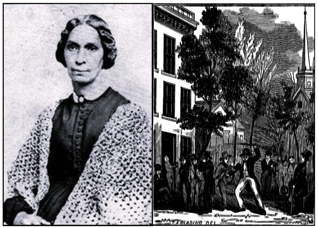 From left: Carloyn E. Storum Loguen about 1860; Mary Ann Brigham Brown’s husband Rev. Abel Brown under assault in Westfield NY about 1835.