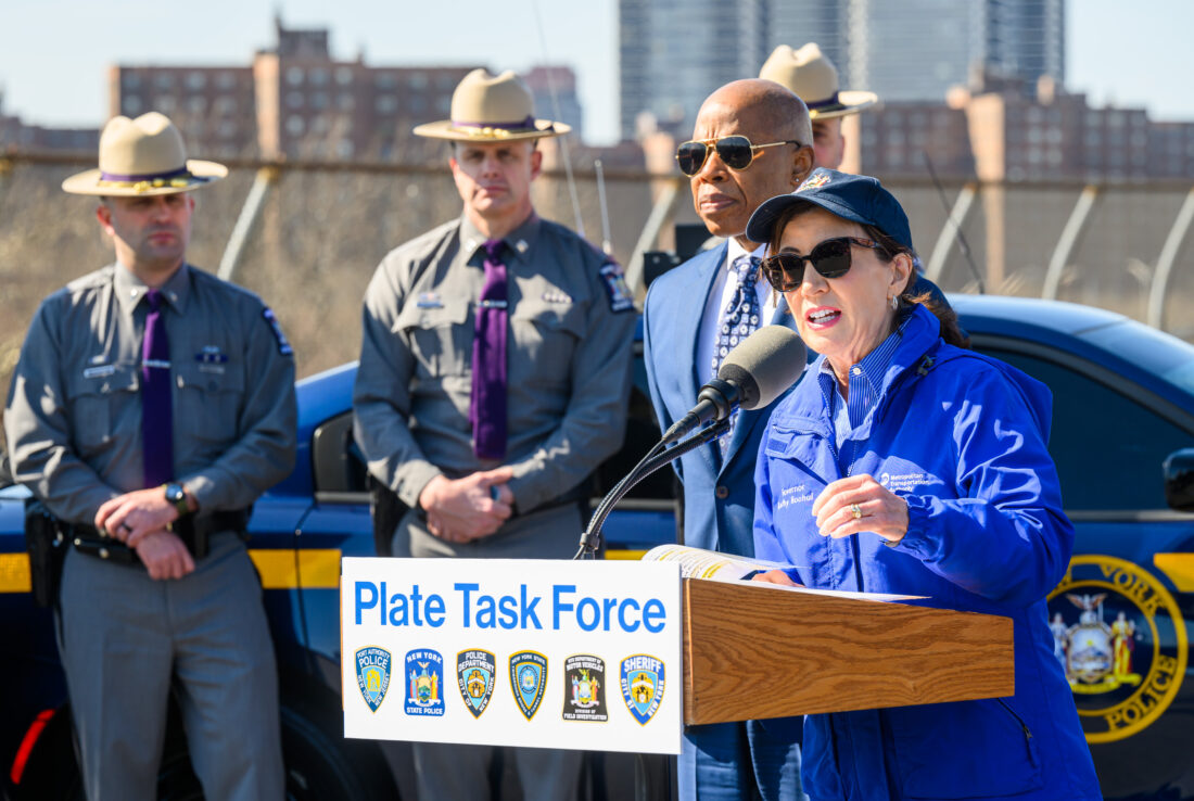 - Gov. Kathy Hochul speaks during a 2024 news conference announcing a crackdown on ghost license plates prevalent in the New York City region.