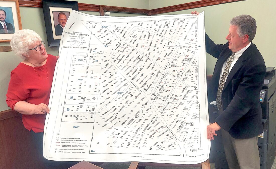 OBSERVER Photo by M.J. Stafford Pomfret Town Supervisor Daniel Pacos, right, and Pomfret Town Board member EvaDawn Bashaw hold a map of Pioneer Cemetery graves. They are helping in an effort to identify as many graves in the cemetery as possible.