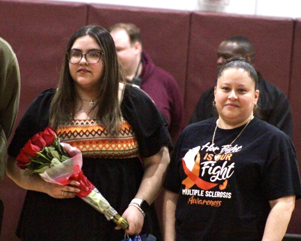 - Hannah Reyes, left, was recognized prior to Dunkirk’s final home game, Wednesday, against Allegany-Limestone. Reyes, the team’s scorekeeper, was diagnosed with Multiple Sclerosis.