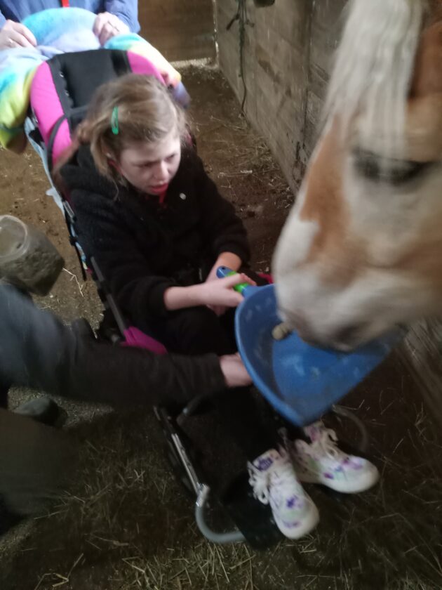 - A participant mounted on a horse. The teacher and aides all said they have never seen her smile so much.