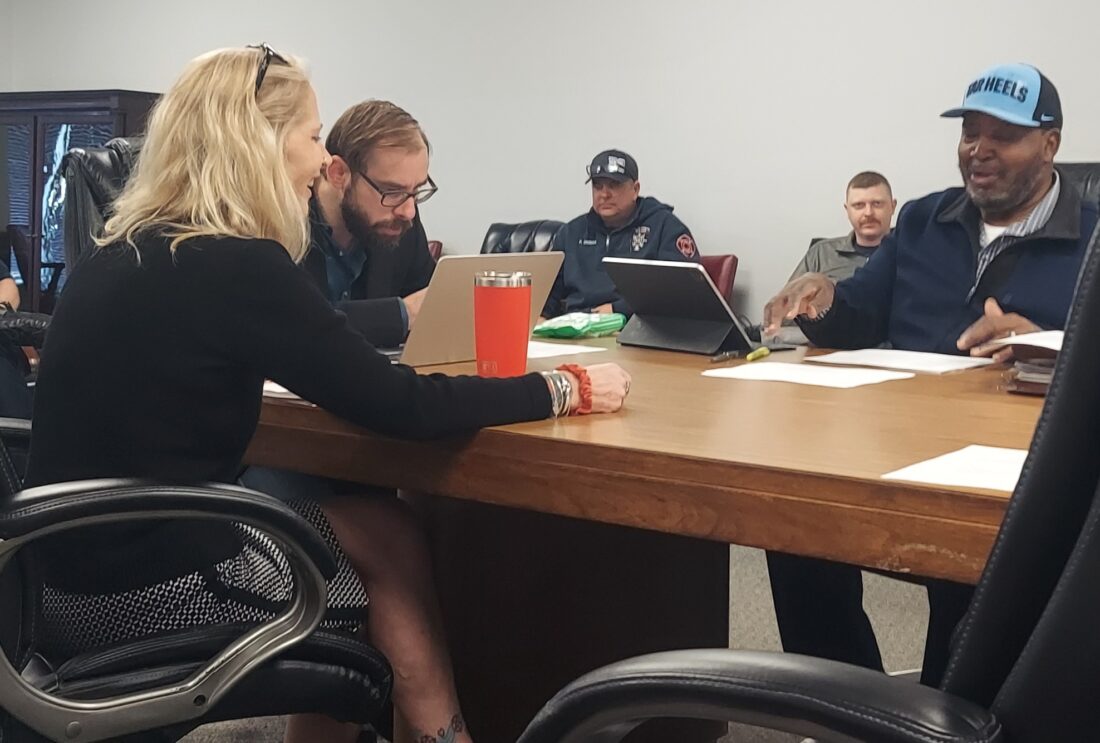 OBSERVER Photo by M.J. Stafford Dunkirk Mayor Kate Wdowiasz, left, shares a light moment with Councilman Frank Torain, far right, before Monday’s Common Council Finance Committee meeting. To the mayor’s right is Councilman-at-large Nick Weiser.