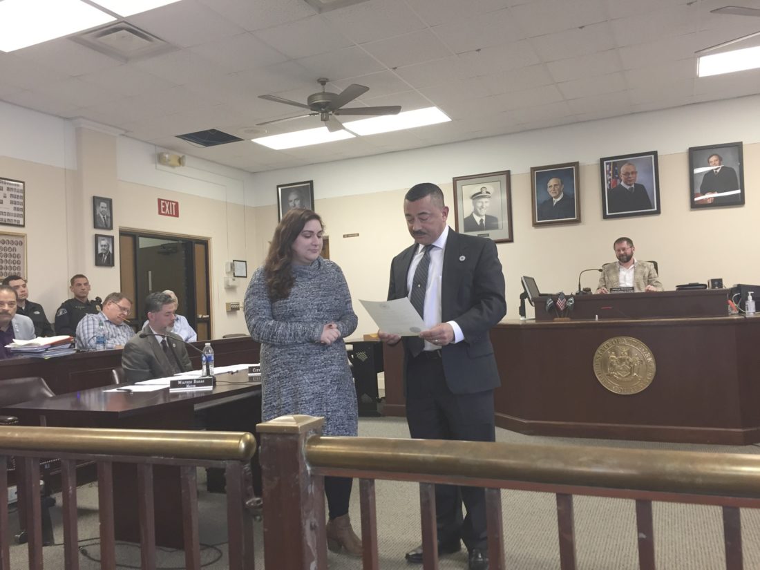Mayor Wilfred Rosas, right, gives a proclamation to Nicole Gugino.