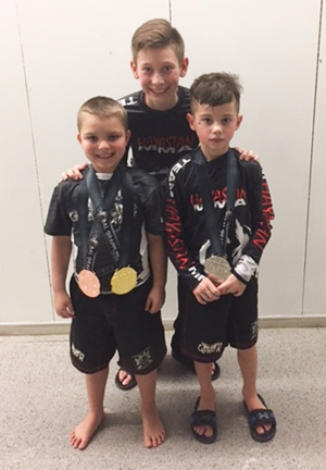 Submitted Photo Norman Yonkers’ Karate Connection MMA & Team Hayastan competed in Ithaca, on Feb. 11th at the “Global Grappling Event.” This was a Gi and No-Gi Grappling tournament. Josiah Ortiz won first and third place, Pauly Tabone won two second-place trophies and Adam Sellari won second in a match with a competitor who was 35 pounds and three years older than him. Pictured in front are Josiah Ortiz and Pauly Tabone. In back is Adam Sellari.