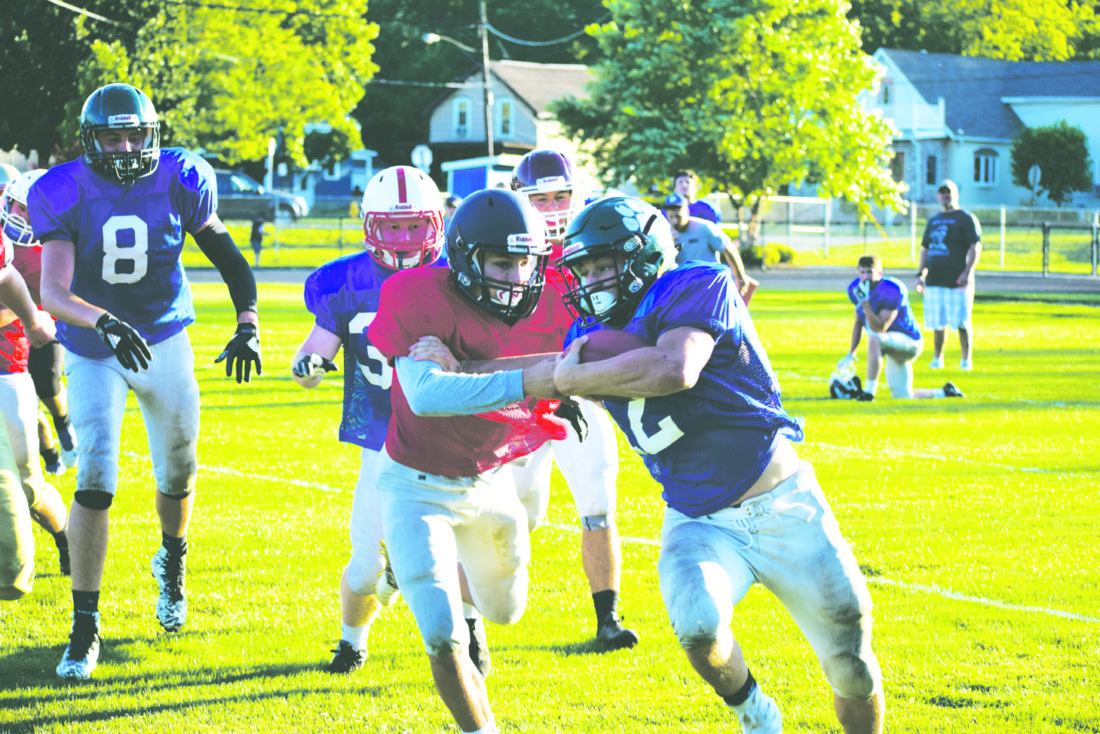 OBSERVER Photo by Andrew David Kuczkowski: Running back Jason Gauthier (12) of Pioneer runs down the sideline as Drew Stevens (16) of Cattaraugus-Little Valley makes the tackle. New York’s Big 30 team practiced at Hillis Field in Gowanda on Friday. The team is preparing for its charity game against Pennsylvania on Saturday, Aug. 5 at Parkway Field in Bradford, Pa.