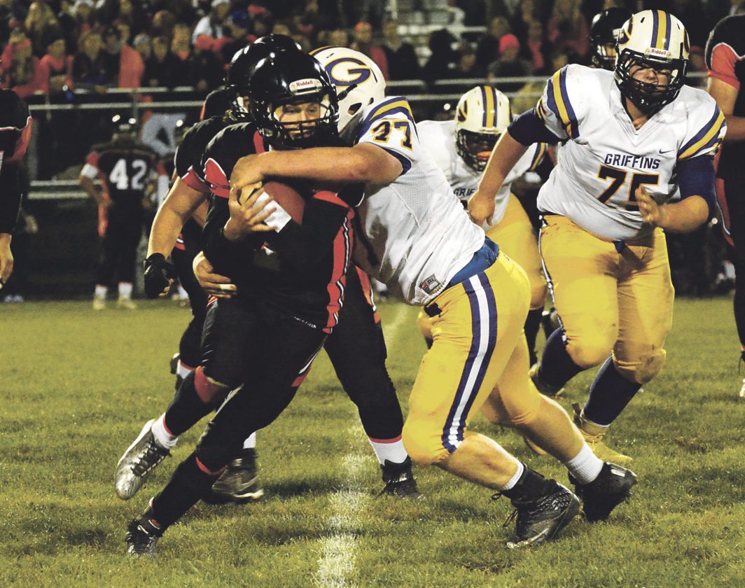 OBSERVER File Photo Fredonia-Westfield-Brocton’s Reid Tarnowski is wrapped up by a Springville player during Friday’s game. The Badgers travel to Akron today to take on the Tigers, a team that, like F-W-B, has a 2-3 record on the season.