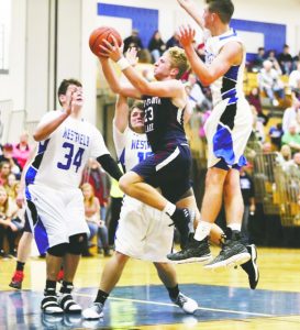 - Devin Pope, middle, is shown during a game while a member of the Chautauqua Lake Thunderbirds against Westfield, at Westfield Academy. OBSERVER File Photo.