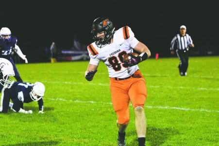 Fredonia’s Jake Skinner (89) carries the ball during a game against Chautauqua Lake/Westfield/Brocton earlier this year. Skinner signed a D-I football scholarship with Central Connecticut on Thursday. OBSERVER File Photo.