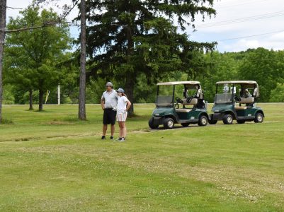 OBSERVER Photo by Jay Young Gino Wise and Lindsay Johnson are pictured Monday morning sizing up the second hole of Chautauqua Point Golf Course, which was recently listed for sale. The nine-hole golf course is considered one of the oldest in Chautauqua County.