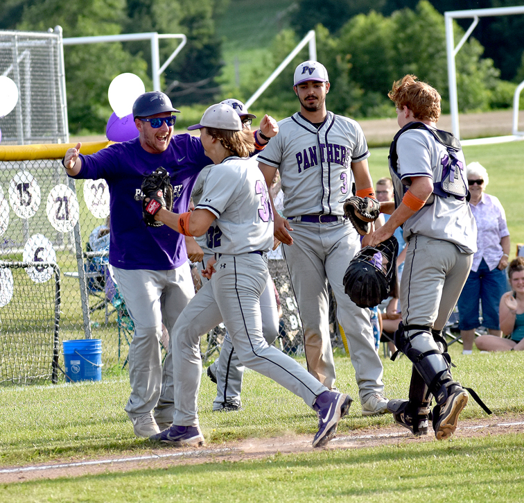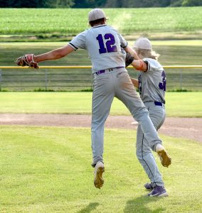 OBSERVER Photo by Matt Spielman Pine Valley pitcher Donavon Guglielmi (12) and first baseman Bryce Sercu celebrate following the final out of Thursday’s Section VI Class D final against Franklinville in South Dayton.