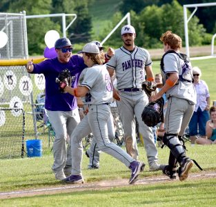 OBSERVER Photo by Matt Spielman Pine Valley assistant coach Jake Cuthbert hugs first baseman Bryce Sercu after the Panthers made the final out to claim the Section VI Class D championship Thursday evening at Charlie LaDuca Field in South Dayton.