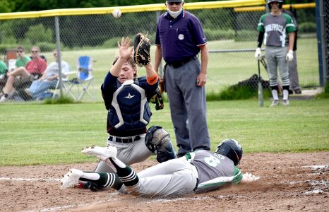 - OBSERVER Photos by Matt Spielman Above, a late throw gets away from Chautauqua Lake catcher Tate Olson as Clymer/Sherman/Panama’s Blake Kopta dives safely into home during Friday’s CCAA Division 2 West game in Mayville. Second, the Thunderbirds’ Nate Engdahl delivers to the plate.