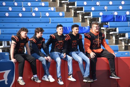 Fredonia football players hang out on Tuesday at Section VI football media day ahead of their Section VI Class C final game against Medina on Saturday at Highmark Stadium in Orchard Park. From left are, Matt Lotter, Simon Davis, Davon McCall, Nick Whitfield and Shawn Farnham. OBSERVER Photo by Scott Kindberg