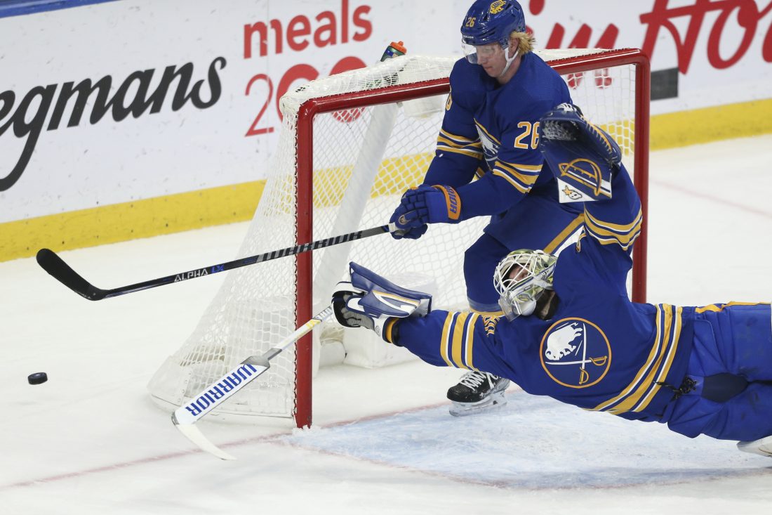 Buffalo Sabres goaltender Aaron Dell (80) dives to attempt to block a shot while defenseman Rasmus Dahlin (26) helps defend during the third period of the team’s NHL hockey game against the Columbus Blue Jackets on Monday, in Buffalo. AP Photo