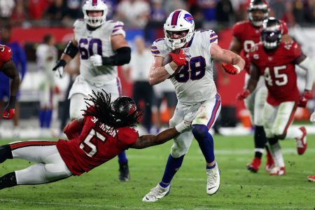 AP Photo Buffalo Bills tight end Dawson Knox (88) slips a tackle by Tampa Bay Buccaneers cornerback Richard Sherman (5) during the second half Sunday in Tampa, Fla.