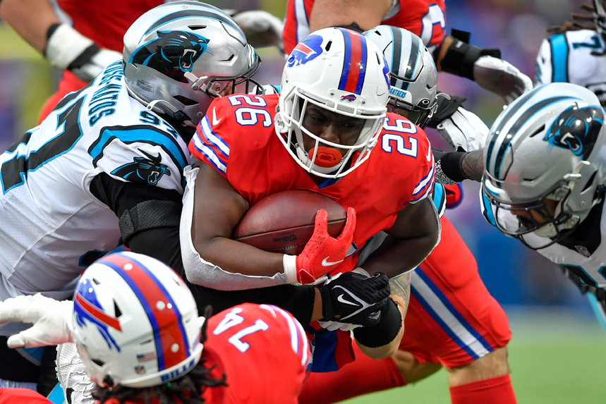 AP Photo Buffalo Bills running back Devin Singletary (26) is tackled by Carolina Panthers defensive end Yetur Gross-Matos (97) during the first half Sunday in Orchard Park.