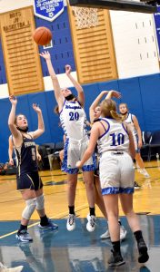 OBSERVER Photo by Matt Spielman Westfield/Brocton’s Tanleigh Bestine (20) shoots in front of Frewsburg’s Elise Sposato, obscured, and Tyra Clark (5) while the Wolverines’ Jena Vacanti (10) looks on during Thursday’s nonleague game in Westfield.