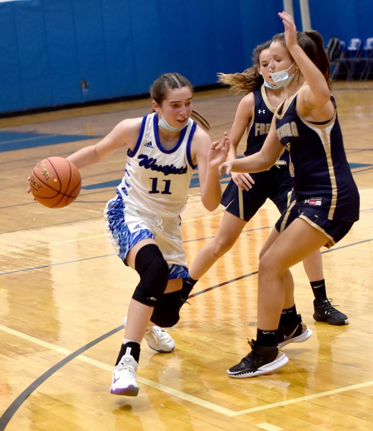 OBSERVER Photo by Matt Spielman Westfield/Brocton’s Haleigh Dellow attempts to get by Frewsburg’s Taytum Jimerson, obscured, and Ava Jimerson, right, during Thursday’s nonleague game in Westfield.
