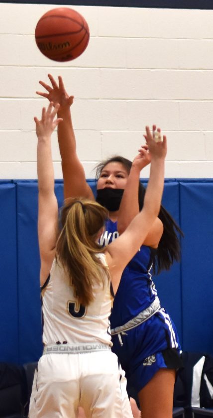 - Gowanda’s Aailyah Stevens takes a shot over Frewsburg’s Kaydan Bush during Tuesday’s game. OBSERVER Photo by Christian Storms