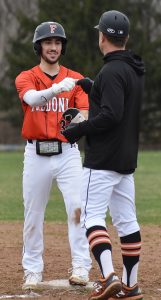 - OBSERVER Photo by Scott Kindberg Fredonia’s Gabe Schrader (3) fist-bumps with first-base coach Jim Rush following his single that drove in two runs during the second inning of Wednesday’s Chautauqua-Cattaraugus Athletic Association Division 1 baseball game at Falconer.