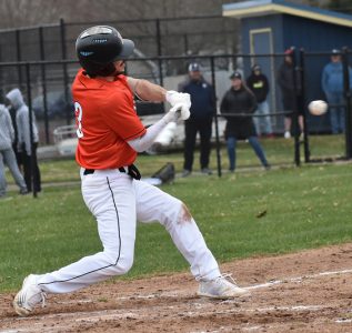 OBSERVER Photo by Scott Kindberg Fredonia’s Gabe Schrader (3) hits a single to drive in two runs during the second inning of Wednesday’s Chautauqua-Cattaraugus Athletic Association Division 1 baseball game at Falconer.