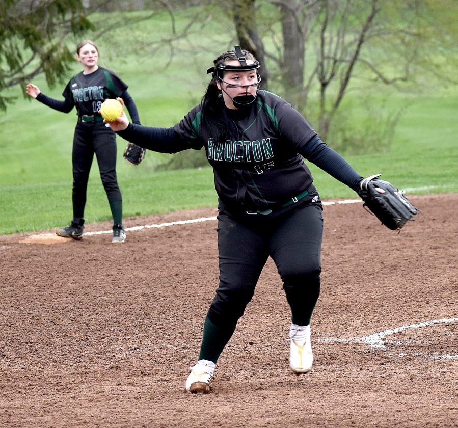 OBSERVER Photo by Matt Spielman Brocton pitcher Haleigh Furman fields a ball and throws to first base during Tuesday’s CCAA Division 1 East game in Randolph.