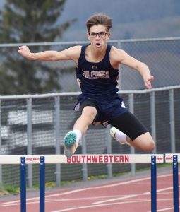 - Falconer/Cassadaga Valley’s Mathis Baehr competes in the boys and girls 400-meter intermediate hurdles against Southwestern at Sirianni Athletic Complex on Tuesday. OBSERVER Photo by Scott Kindberg