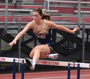 - Falconer/Cassadaga Valley’s Hannah Madonia competes in the girls and boys 400-meter intermediate hurdles against Southwestern at Sirianni Athletic Complex on Tuesday. OBSERVER Photo by Scott Kindberg