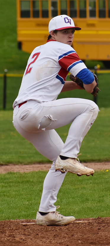 Cassadaga Valley pitcher Braden LeBaron winds up during Thursday’s Chautauqua-Cattaraugus Athletic Association Division 2 game against Clymer/Sherman/Panama in Westfield. OBSERVER Photo by Christian Storms