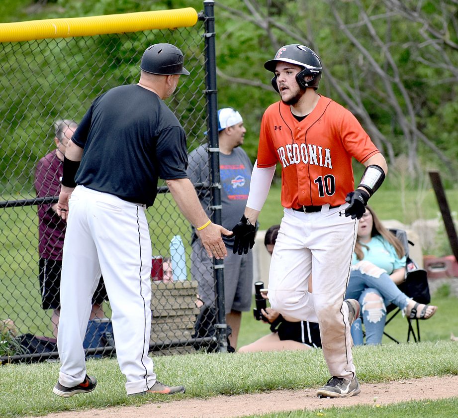 OBSERVER Photo by Matt Spielman Fredonia's Matt Cash is congratulated by Hillbillies head coach Tim Cowan after Cash hit a home run during Saturday's CCAA Division 1 game against Dunkirk at Al Stuhlmiller Field in Dunkirk.