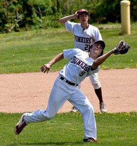 - OBSERVER Photo by Matt Spielman Dunkirk third baseman Brady Corbett catches a pop fly in front of shortstop Tyler Karin during Saturday’s CCAA Division 1 game against Fredonia at Al Stuhlmiller Field in Dunkirk.