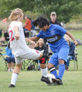 OBSERVER Photo by Scott Kindberg Maple Grove’s Dan Schlemmer challenges Westfield/Brocton’s Jordin Lopez for the ball during Monday’s CCAA Central Division game at the NorthLake Family Recreation Center in Westfield.
