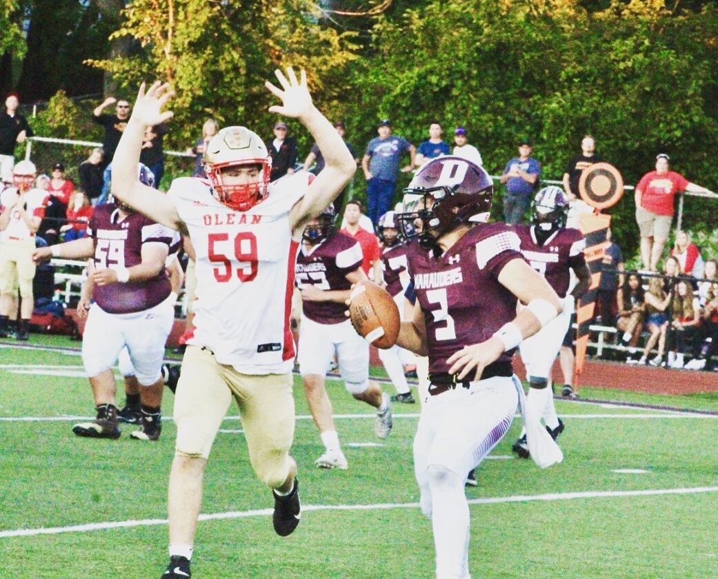 - Olean’s Lucas Brushingham (59) puts pressure on Dunkirk quarterback Noah Sikes (3) during the first half of Friday’s game in Dunkirk. OBSERVER Photo by Braden Carmen.