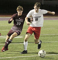 Dunkirk’s Bradon Gustafson (23) and Southwestern’s Jaydon Work (19) battle for possession during Wednesday’s game in Dunkirk. OBSERVER Photo by Braden Carmen