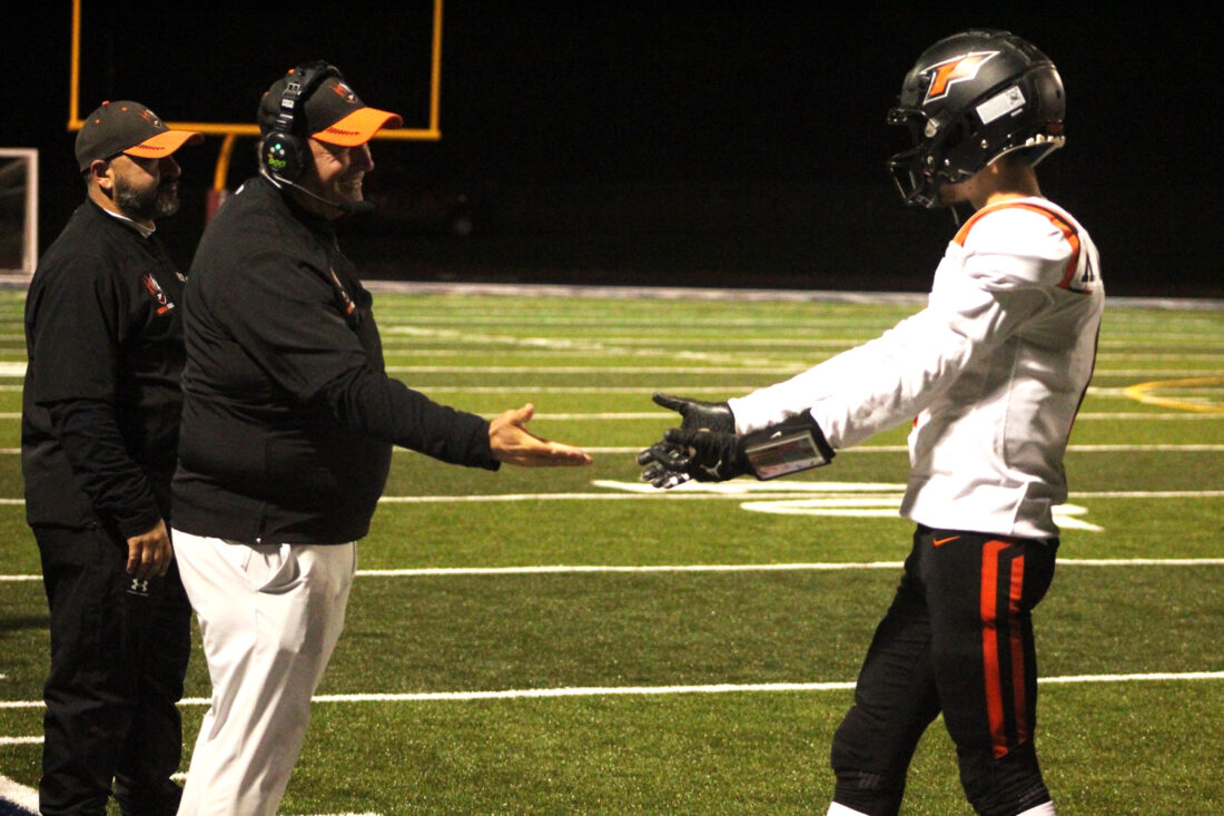 - Fredonia head coach Greg Sherlock, left, celebrates after a touchdown with Keegan Whitfield, right, during Friday’s Class C South victory over the Chautauqua Lake/Westfield/Brocton Thunderbirds at Chautauqua Lake Central School. OBSERVER Photo by Braden Carmen.