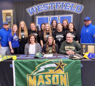 - Westfield senior Haleigh Dellow, pictured in front flanked by Wendy, her mother and assistant coach, and Wade, her father and team manager, signed her national letter of intent to attend George Mason University and play softball for the Patriots on Thursday. In back, from left, are: assistant coach Jack Burgess, Maddie Burgess, Mackenzie Schumaker, Cassidy Phillips, Drew Ernewein, Eva Gnadzinski, Keara Kincaid, Sydney Hotchkiss, Tanleigh Bestine, Brynn Ernewein and head coach Shawn Gnadzinski. Casey Black was absent. Submitted Photo