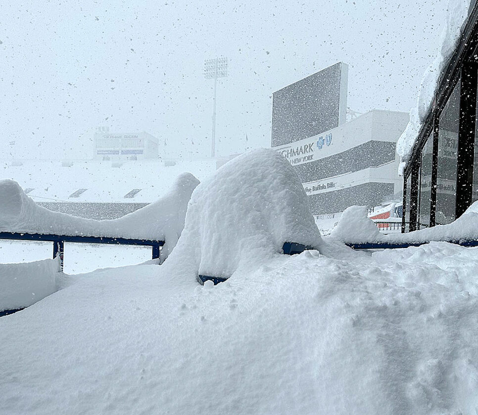 Snow covered Highmark Stadium on Friday as a winter storm stalled over Orchard Park. Photo courtesy of Buffalo Bills Twitter