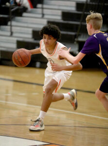 OBSERVER Photo by Ashleigh Brown Fredonia’s Sal Tabone dribbles into the lane as Springville’s Cole Kreitzbender approaches to defend.