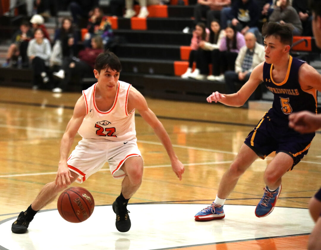 - OBSERVER Photo by Ashleigh Brown Fredonia’s Sal Tabone dribbles into the lane as Springville’s Cole Kreitzbender approaches to defend.