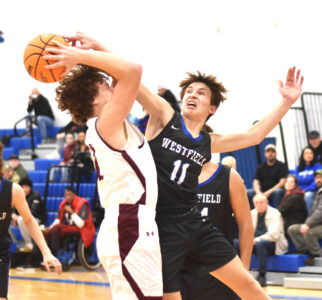 - Westfield’s Carson Swanson blocks a shot by Dunkirk’s Greg Orcutt during the boys Martin Luther King Jr. Day High School Showcase. OBSERVER Photo by Christian Storms