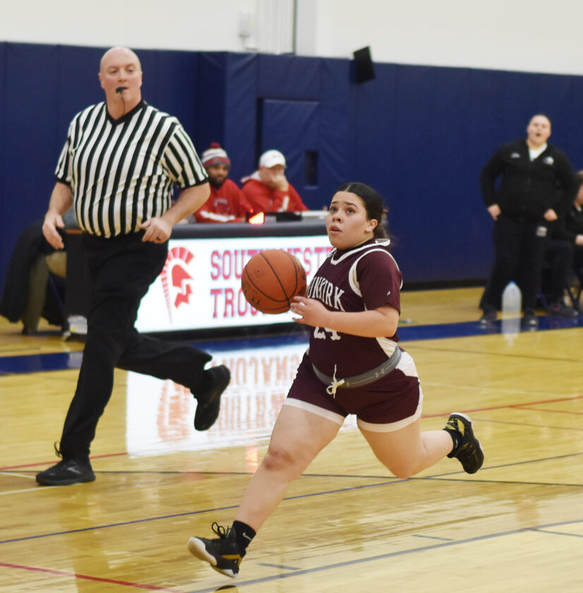 - Dunkirk’s Anadallane Rodriguez dribbles up court against Southwestern in a Chautauqua-Cattaraugus Athletic Association Division 1 West girls basketball game on Tuesday. OBSERVER Photo by Scott Kindberg