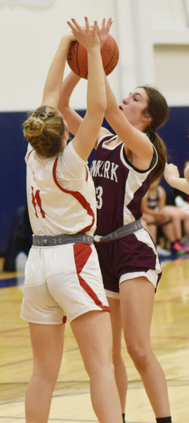 - Dunkirk’s Shyla Karin puts up a shot while being defended by Southwestern’s Braya Beaver (11) during Tuesday’s CCAA Division 1 West game. OBSERVER Photo by Scott Kindberg