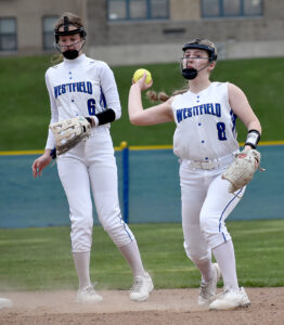 - Westfield’s Eva Gnadzinski throws to first base during Tuesday’s nonleague game against Falconer in Westfield. Looking on is the Wolverines’ Tanleigh Bestine. OBSERVER Photo by Matt Spielman