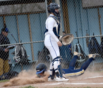 - Falconer’s Emily Rhienhart dives into home to score the Golden Falcons’ first run of Tuesday’s nonleague game against Westfield. Standing is Wolverines catcher Sydney Hotchkiss. OBSERVER Photo by Matt Spielman