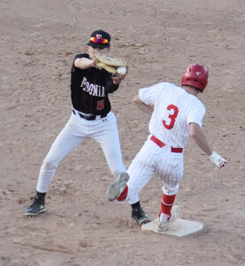 - Fredonia first baseman Matt Cowan tries to hang on to the ball as Jamestown’s Caleb Piazza (3) crosses the bag during the first inning of Saturday night’s Chautauqua-Cattaraugus Athletic Association Division 1 baseball game at Diethrick Park. Piazza was ruled safe when Cowan bobbled the ball. OBSERVER Photo by Scott Kindberg