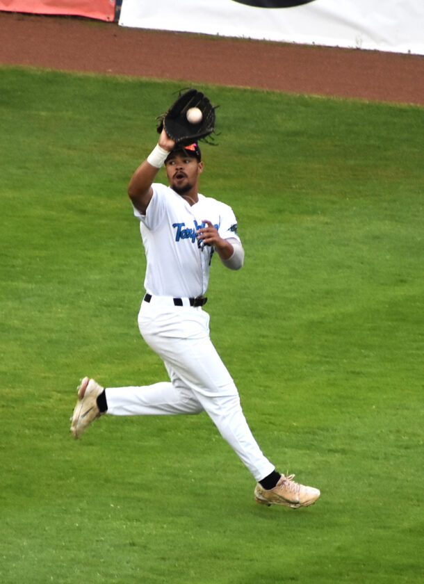 Jamestown right-fielder Drew Garth makes a catch during Wednesday’s PGCBL at Diethrick Park. OBSERVER Photo by Scott Kindberg